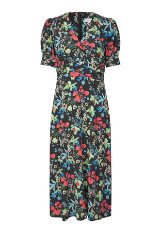 Small pleats at the waist are used to create a chic fitted silhouette on this V-necked silk dress that falls to mid calf. The joyful print of bright flowers on a black background add an extra feminine appeal as do the short full sleeves that are held closed with self fabric tapes.