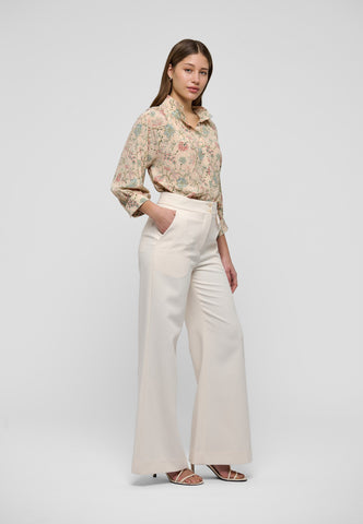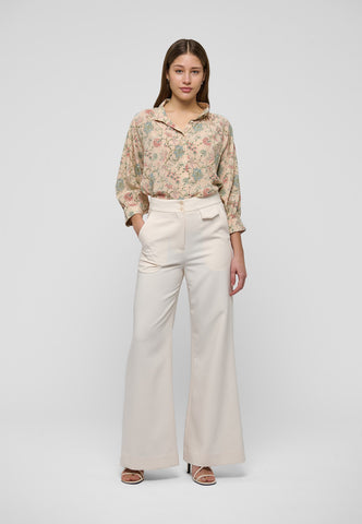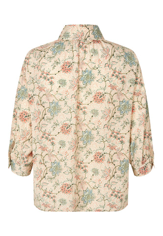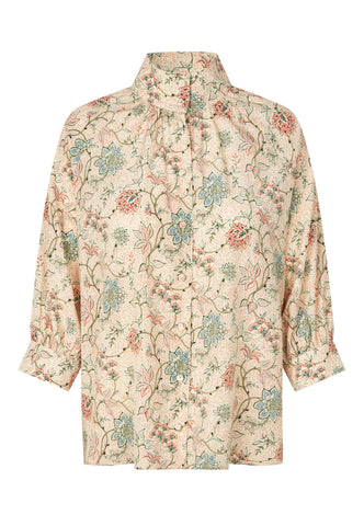 With its print of soft coloured flowers, this silk shirt is relaxed and yet still elegant. The body gathers with tiny tucks at the front and back into a high stand collar with multi-stitching and it has 3/4 length full sleeves