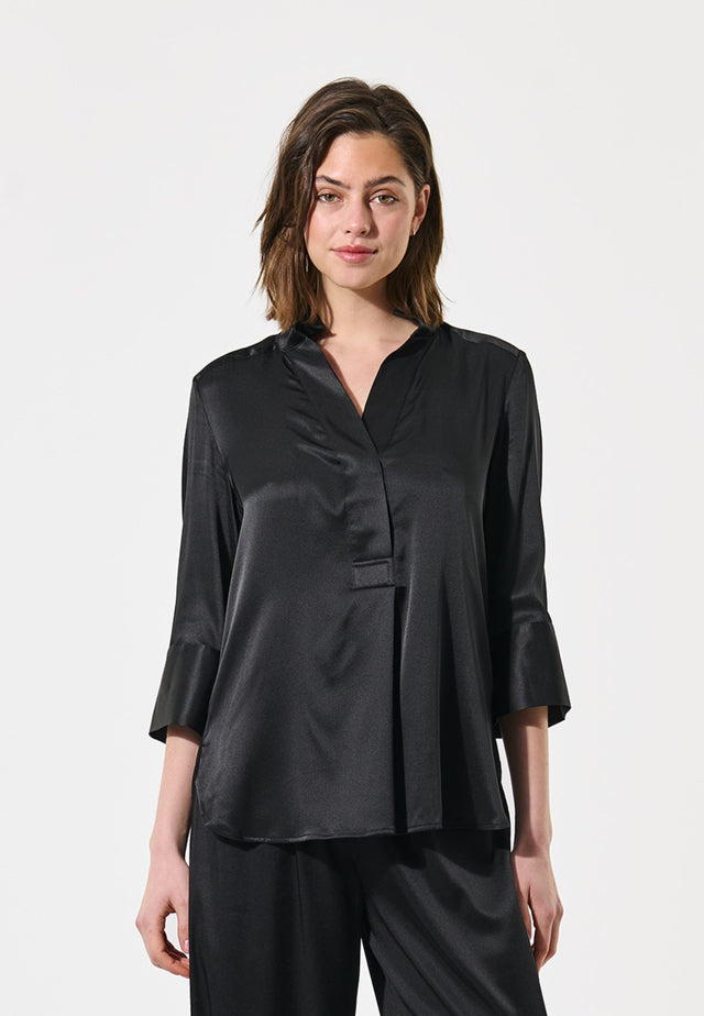 Elegant and sophisticated, this black silk blouse has a regular fit with a stand collar and cross-over neckline. Style under a jacket for the day or pair with a skirt for a more evening look.