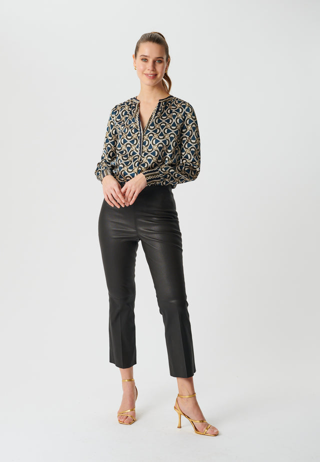 A graphic equestrian-inspired print, rendered in luxurious stretch silk twill, has a contrast neckband, placket and cuffs to add the perfect finishing detail. Furthermore, gentle gathers at the neck bring a touch of ease to the blouse. The blouse is made from 92% stretch silk satin and 8% elastane.
