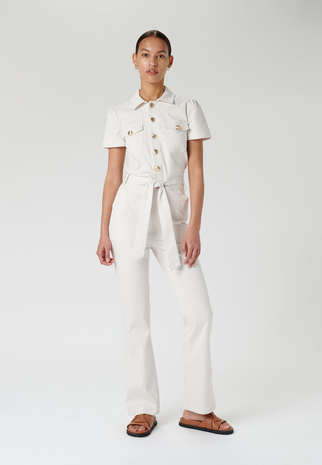 Evoking the sporty chic of the Seventies, this stylish white jumpsuit has a vintage appeal that works perfectly for today’s woman. Short sleeved and with brass buttons and a tie waist, it is slim fit with straight legs. The jumpsuit is 97% cotton 3% elastane vintage stretch twill.