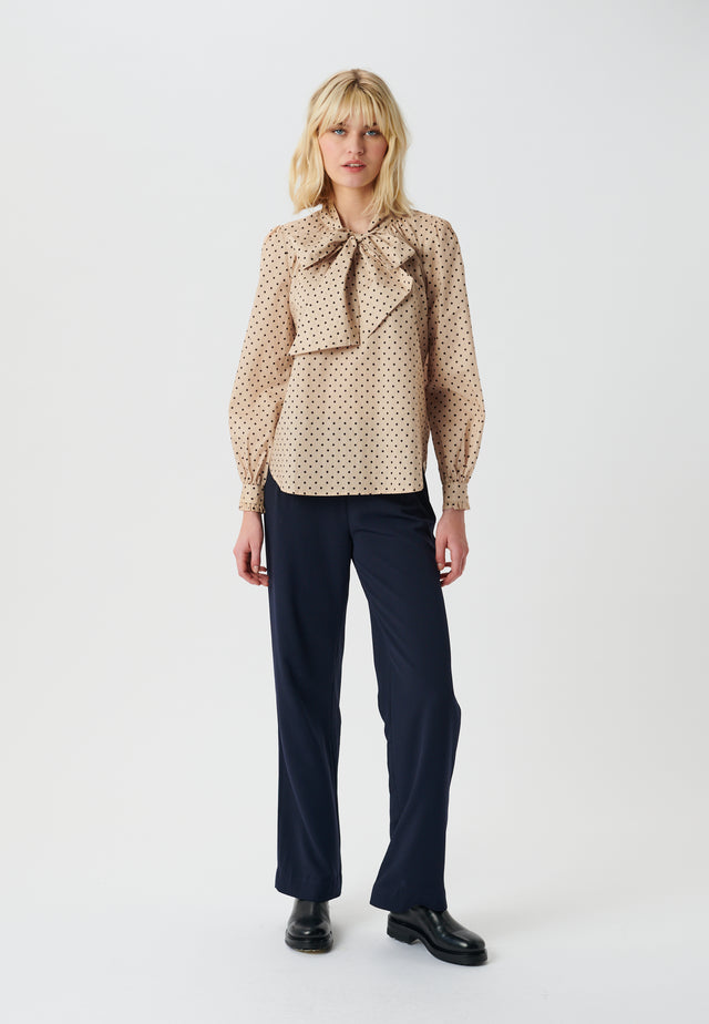 Shirt with bow, puff sleeves and ruffle details at cuff. Non stretch fabric