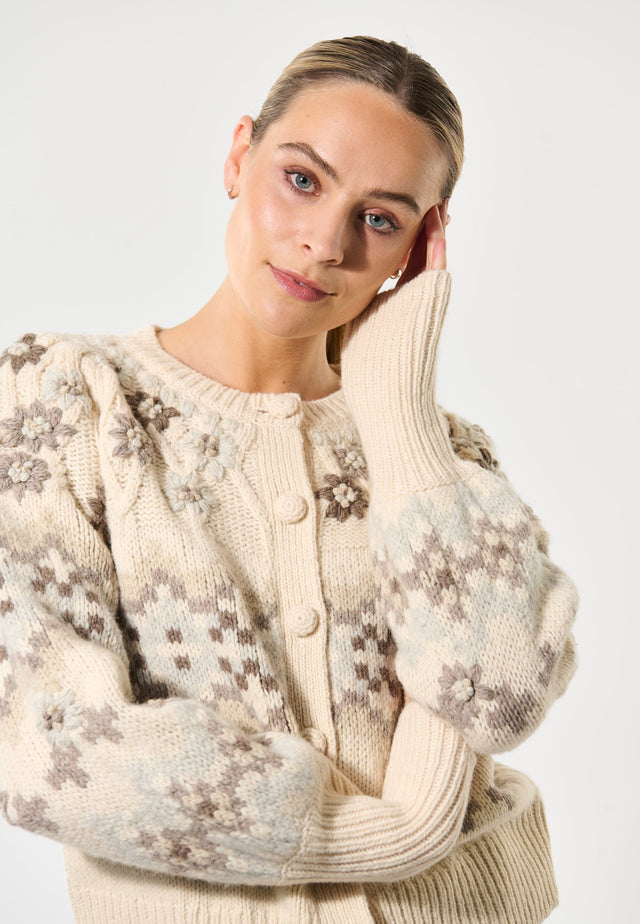 A fashionable cover up in chilly weather, this round neck fitted cardigan features a jacquard design in cream and brown decorated with embroidered flowers. The short length is finished with deep ribs at cuffs and waist and it is fastened with pretty crocheted buttons.