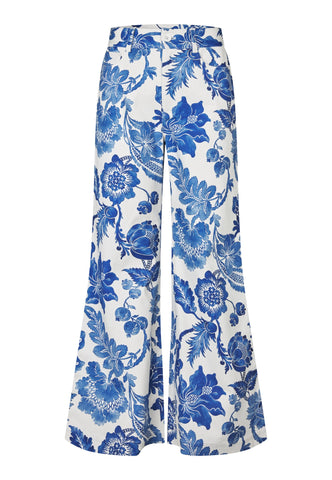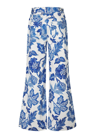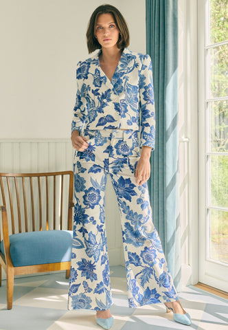 Fitting close to the hips and high on the waist before flaring out to the hem, these striking trousers are in a bold print of large blue flowers. Western jeans style front and back pockets add an urban attitude. The trousers can be worn alone or matched with the Daniela blazer.