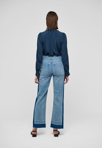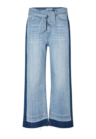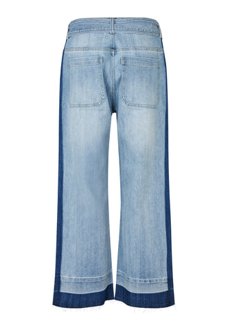 Two different colours and washes of denim are used to create a striking pair of straight leg trousers with panels of darker fabric running down the sides and around the hem. Cropped slightly to the ankle, the trousers have jeans style pockets at the front and back and are pulled into the waist with a self fabric belt.