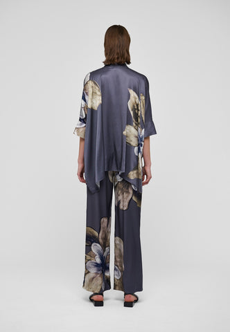 Oversized and easy to wear, this very wide cut blouse in a beautiful floral print silk has 3/4 length sleeves, a hidden button front and a small stand collar. Wear with jeans for a casual day look or dress it up with a skirt for evening.