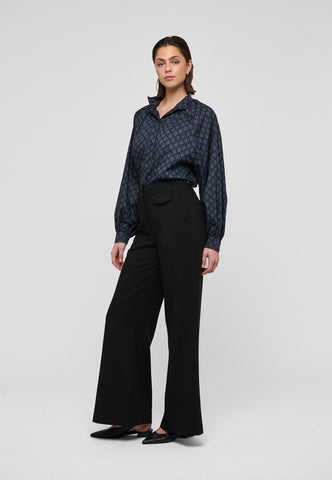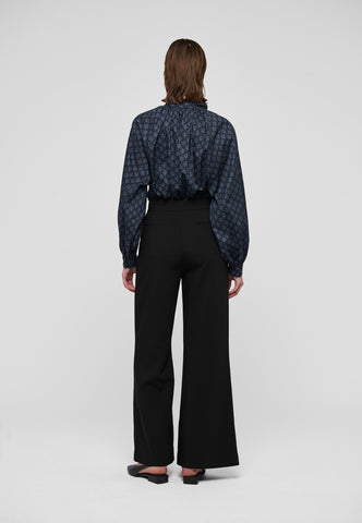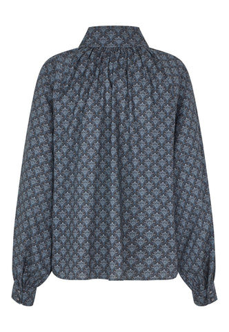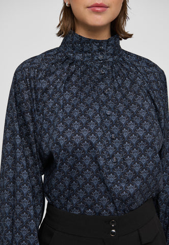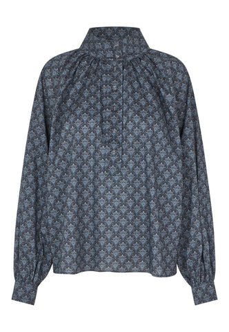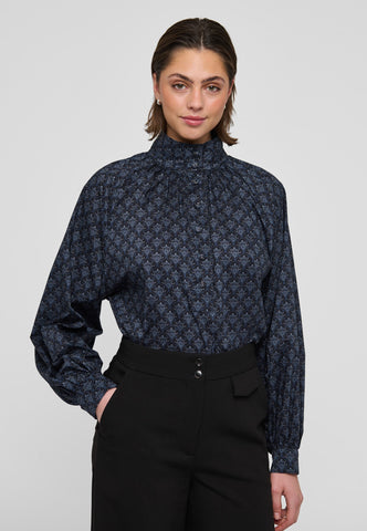 Delicate tucks gather the body into the multi-stitched high stand collar of this loose fit raglan sleeved blouse. The cotton voile fabric printed with a small graphic design and covered buttons add a sophisticated attitude.