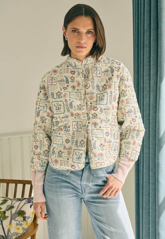 Cosy but very chic, this quilted cotton jacket is perfect for those chilly spring days. Decorated with a charming print of embroidered patches and motifs, the jacket has a stand collar with multi stitching, binding around the edges and two jet pockets at the front. It is cropped in length, has 3/4 sleeves and closes with covered snap buttons.