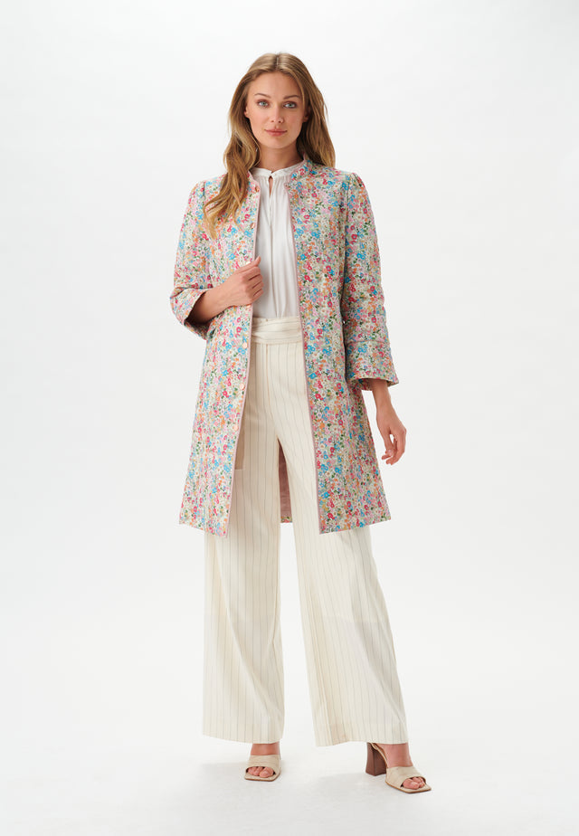 Long quilted jacket with 7/8 sleeves, pockets and push buttons. Tight fit quiltet non stretch fabric