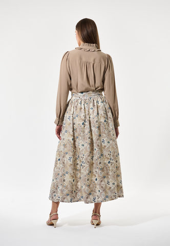 Two rows of frills held together with a self fabric bow form a dramatic collar on this chic and sophisticated blouse made from soft beige coloured silk. Full sleeves add to the silhouette and tiny frills finish off the cuffs.