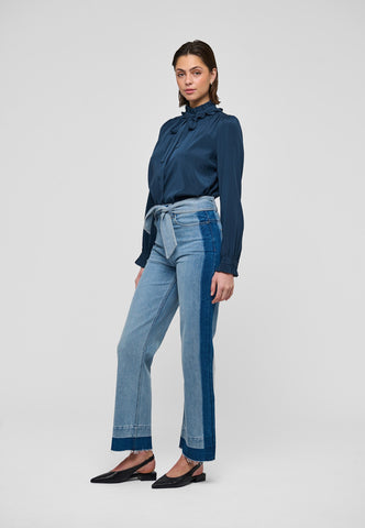 Two rows of frills tied together with a self fabric bow form a dramatic collar on this beautiful and sophisticated blouse made from midnight blue silk. Full sleeves add to the silhouette and tiny frills finish off the cuffs.