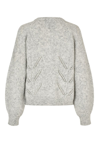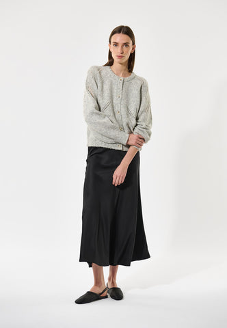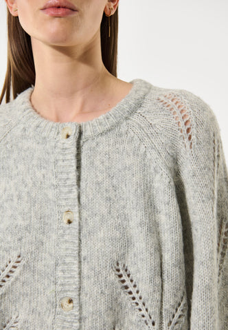 Oversized fashioning creates a delicate decorative feature on the front, back and sleeves of this wool blend cardigan. It has a round collar and volume sleeves and makes a cosy and stylish cover up for chilly days.
