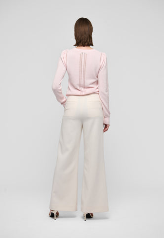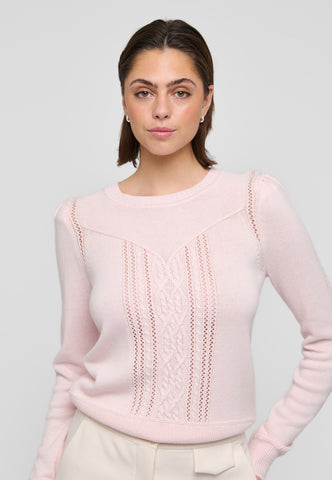 Dainty cabling and lace stitching run down the centre body and sleeves of this round neck sweater whilst a seam accentuates the bust line. Knitted in a cotton/wool blend in pale pink, the sweater has more lace knit and gathers around the shoulders.