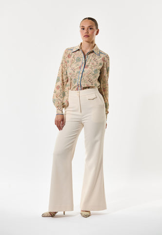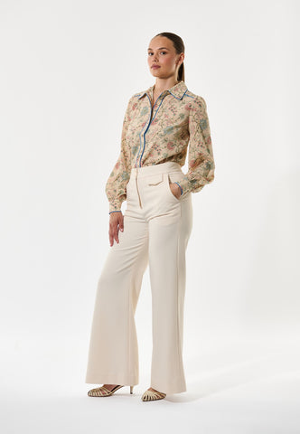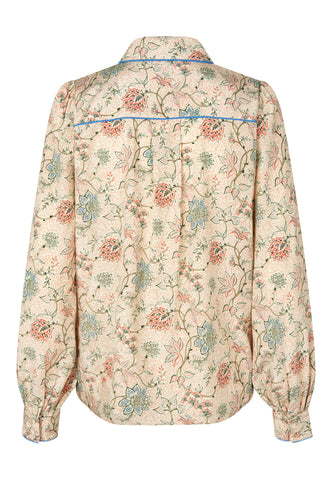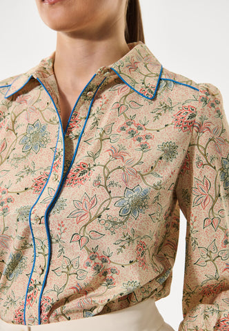 Running around the collar, across the shoulder and down the front of this floral printed silk shirt is bright blue piping giving a graphic contemporary edge to a classic garment. It is in a regular fit with full sleeves and a hidden button placket.