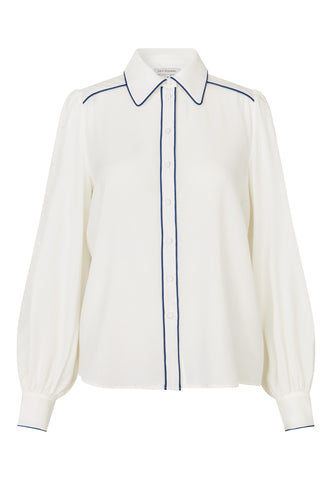 Sleek black piping runs around the collar, across the shoulder and down the front of this chic off-white silk shirt creating a graphic, modern twist on a classic garment. It is in a regular fit with full sleeves and a hidden button placket.